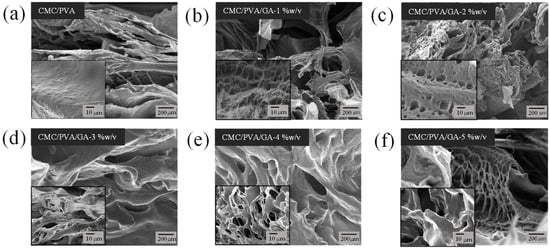 The CMC/PVA hydrogel was treated with varying concentrations of CA additive agents (2–10% w/v), and the crosslinking percentage was examined, as shown in Figure 2a. Similarly, different GA concentrations (1–5% w/v) were also used to improve the crosslinking percentage in CMC/PVA. It was found that the crosslinking agent properties of hydrogels corresponded with the pore size in hydrogel films, depending on the type and concentration of crosslinking agents (CA and GA). As a result, Figure 2a reveals the increment of crosslinking percentage in CMC/PVA/CA for 35.01 to 81.51% (a–e), which is influenced by adding CA concentrations corresponding to 2–10% w/v. CMC/PVA/GA also indicated the crosslinking percentage increase from 16.81 to 59.78% (a–e), which is implicated by the overfilled higher GA concentrations for 1–5% w/v, as shown in Figure 2b. However, the crosslinking percentage of both hydrogels implied an increased development of porous capability on hydrogel films, correlating with the swelling properties of hydrogels [44]. Thus, the morphology of both hydrogels with and without crosslinking from CA and GA was investigated.