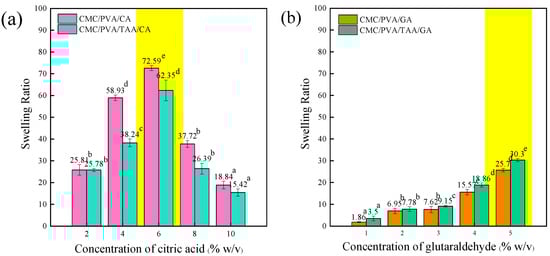 Comparison of the swelling properties from crosslink agent between (a) CA and (b) GA in CMC/PVA hydrogel film conditions combined with TAA in a component (yellow highlight: the highest swelling ratio).