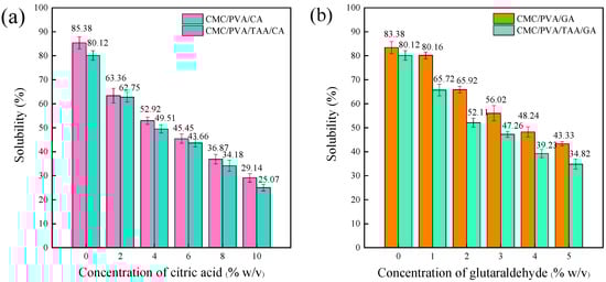 Solubility percentage of (a) CMC/PVA/CA and CMC/PVA/CA/TAA and (b) CMC/PVA/GA and CMC/PVA/GA/TAA hydrogel films.