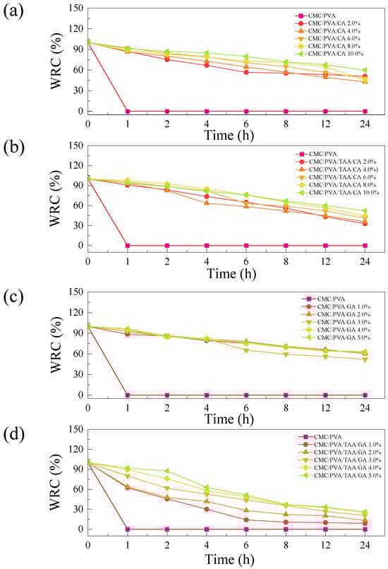 WRC of CMC/PVA hydrogel films incorporated with (a) CA, (b) TAA/CA, (c) GA, and (d) GA/TAA.