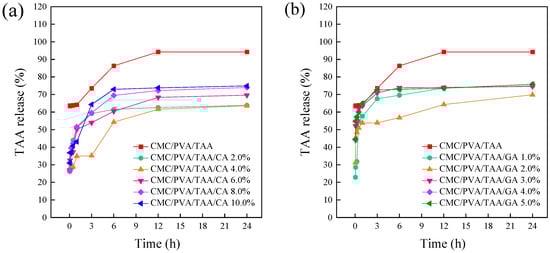 Drug release ability of CMC/PVA/TAA with different concentrations of (a) CA and (b) GA additive crosslinked agents.