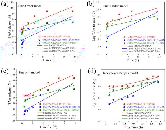 TAA release data fitted with different kinetic models, the (a) zero–order, (b) first–order, (c) Higuchi, and (d) Korsmeyer–Peppas models.