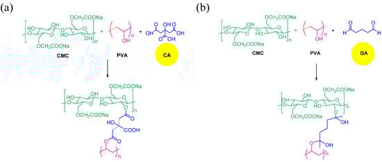 In general, the mechanical properties of CMC films can be enhanced by blending with other polymers such as poly(vinyl alcohol) (PVA) and adding a crosslinking agent. Glutaraldehyde (GA) [7] is classified as a crosslinking agent, favoring usage in crosslinked CMC/PVA hydrogel films. The crosslinking effect on the properties of CMC/PVA films has been investigated, revealing that the addition of GA resulted in the improvement of the mechanical strength of the hydrogel film by utilizing methylene blue sorbents [8,9]. GA also induced essential features in the development of water-soluble CMC/PVA hydrogel films for use as a drug delivery material (drug release) through the crosslinking effect [9]. Furthermore, citric acid (CA) is another crosslinking agent used to improve the properties of CMC/PVA due to its low cost and non-toxic properties [10].
