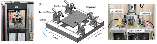 Considering the differences in damage modes caused by boundary conditions, the fixture and indenter of the QSI test were consistent with those of previous LVI studies. QSI tests were conducted using a servo–hydraulic testing machine with a Φ19 mm spherical head indenter at the center of the specimens, as shown in Figure 2a. The specimens were supported over a 125 × 75 mm2 rectangular hollow window fixture and were held with four toggle clamps at their four corners (Figure 2b). In accordance with Ref. [35], the tests were carried out using displacement control, at a constant rate of 2 mm/min. AE sensors were placed on the surface of the specimens (Figure 2c) to obtain their AE signals under the loading process; the AE signals were analyzed to distinguish damage mechanisms including matrix cracking, delamination, and fiber fracture. The QSI process was divided into four deflection levels (deflection is the displacement of the indenter during the test) to explore damage development under different deflections. Each specimen was tested at least three times in all tests and the permissible error of the results was controlled within 5%.