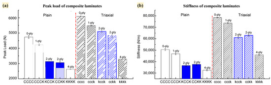 Composite laminates with different hybrid plies and intercalation order of carbon/Kevlar laminates under QSI: (a) peak load of specimens; (b) stiffness of specimens.