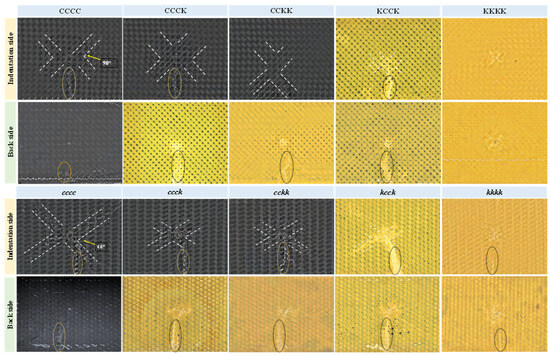 Figure 11 demonstrates the load–deflection curves of five different groups of composite laminates (CCCC, CCCK, KCCK, CCKK, and KKKK) under four different deflection stages (1, 2, 3, and 4) and the apparent surface damage areas at the indentation side and reverse side. For the laminates CCCC, CCCK, and CCKK in Figure 11b, Figure 11d, and Figure 11h, respectively, whose indentation surfaces consisted of the carbon fabric ply directly in contact with the indenter, an obvious X-shaped damage area related to the braided load-bearing yarns was observed. However, for the laminates KCCK and KKKK in Figure 11f,j, the Kevlar fabric ply was applied on the indentation surfaces and the X-shaped damage morphology on the top surfaces of the indentation side could be effectively alleviated. Material parameters indicated, as mentioned in Section 2.1, that the Kevlar had a better toughness than the carbon fiber, which could transfer the compressive stress on the indentation surface to a wider range along the interlaced yarns via the dispersive resin cracks, effectively avoiding a large number of resin cracks and fiber brittle fractures caused by the stress concentration of the interlaced yarn on the carbon surface. Therefore, X-shaped damage on the KCCK and KKKK structures was not obvious. Moreover, due to the brittleness of carbon fibers, the carbon fiber yarns on the reverse side found it difficult to propagate stress along the main load-bearing yarn’s direction. This resulted in a significantly smaller damage area on the non-loaded surface with carbon fiber compared to that with Kevlar.