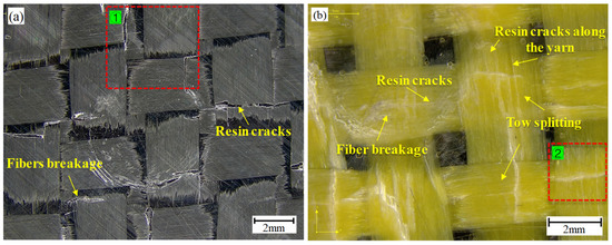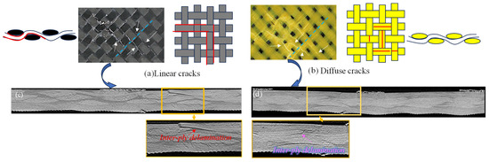 According to the load–deflection curves and AE amplitude characteristics of the specimens, four QSI tests were conducted on the same specimens under different deflections, from which the progressive damage process characterization of the specimens could be obtained (see Figure 11).