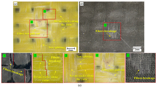 It is generally believed that curve fluctuations are caused by resin and fiber breakage, while larger fluctuations are caused by damage to fiber bundles. However, the load–deflection curve stage and damage morphology stage are used in this paper, as shown in Figures 7c,e and 11 and Table 4. It was concluded that the jitter highlighted with blue arrows was the pull-out damage of the Kevlar fiber bundle on the reverse side. After the peak load, the laminates entered the failure stage of rapid degradation of the bearing capacity (as marked with the green circles in Figure 3a), corresponding to the yarn’s rupture (as shown in Figure 5).