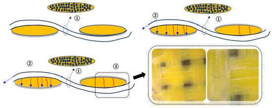 Damage development of Kevlar distributed on the reverse side. Key: ① Resin cracks inside the yarn; ② under the tensile and compressive stress of the upper and lower interlaced points, resin cracks formed along the direction of the interwoven yarns on the reverse: ③ Kevlar reaches the damage threshold and exhibits irregular pull-out fracture damage.