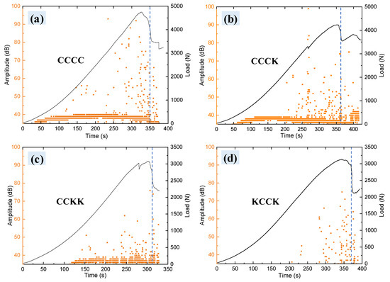Figure 9 shows the AE response characteristics of the specimens during the QSI process, indicating that matrix cracking occurred first, followed by delamination and finally, fiber failure (fiber pull-out and fiber fracture). However, the final failure time of the carbon/Kevlar hybrid laminates was different with different hybrid plies and intercalation orders. CCCK (Figure 9b, 232s) and KCCK (Figure 9d, 370s) showed longer bearing duration compared with CCCC (Figure 9a, 350s), CCKK (Figure 9c, 312s), and KKKK (Figure 9e, 325s). A longer bearing duration [9] usually means that CCCK and KCCK have a better potential to inhibit damage development. The damage development analysis of the Kevlar on the non-loading side in Section 3.3 indicated that, in comparison to carbon surfaces, Kevlar surfaces tended to develop a large number of diffuse micro-resin cracks; these micro-resin cracks contributed to the dissipation of energy and the distribution of stress, thereby enhancing the overall durability and damage resistance of the material and mitigating the occurrence of structural failure caused by the tensile deformation threshold. Therefore, the single ply of Kevlar on the non-loaded side (CCCK and KCCK) exhibited larger failure deflections, indicating longer load-bearing durations. Conversely, the strength of hybrid structures with multiple plies (two plies or more) of Kevlar on the reverse side was reduced significantly and the tensile fracture stress threshold advanced, leading to earlier structural failure in the CCKK and KKKK structures.