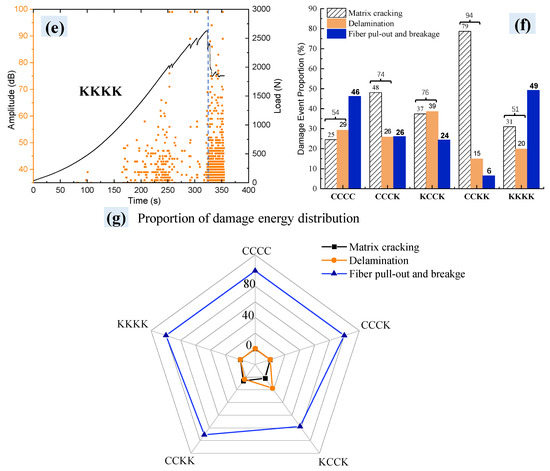 AE response characteristics of the laminates during QSI process: (a–e) AE amplitude and load–time curves; (f) damage event proportional distribution; (g) damage energy proportional distribution.