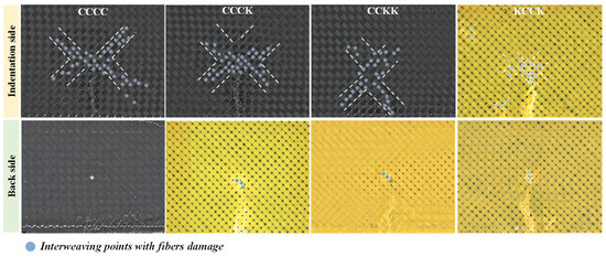 As shown in Figure 10 and Table 4, the fiber bundle damage to the interweaving points of specimens on the indentation and reverse sides was marked and quantified, excluding bulge edge damage. With the increase in the number of Kevlar hybrid plies on the reverse side, the number of interlacing points of fiber bundle damage on the indentation surface decreased, while their number on the non-load side did not significantly change. This indicated that as the Kevlar ratio increased, the amount of fiber bundle damage decreased. As discussed in Section 3.3, brittle fracturing of the entire carbon yarns appeared under stress, due to the brittle characteristics of the carbon fibers, rather than limited fiber pull-out damage to the Kevlar. Therefore, with the ratio of carbon fibers increasing in the hybrid structure, the proportion of fiber damage also increased. Meanwhile, as the number of Kevlar plies increased, the proportion of resin cracks within the Kevlar yarn increased, further leading to a relative decrease in the percentage of fiber damage. Above all, the proportion of energy consumption attributed to the fiber damage of specimens decreased with the increase in Kevlar hybrid plies on the reverse side.