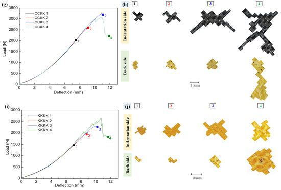 Load–deflection curves and macroscopic damage morphology of the composite specimens at four different deflections from Stage (1) to Stage (4). (a,b) CCCC; (c,d) CCCK; (e,f) KCCK; (g,h) CCKK; (i,j) KKKK.