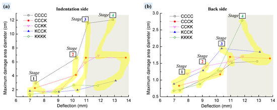 Maximum diameter of the surface macroscopic damage area of composite specimens at four different deflections from Stage (1) to Stage (4). (a) Indentation side; (b) Back side.