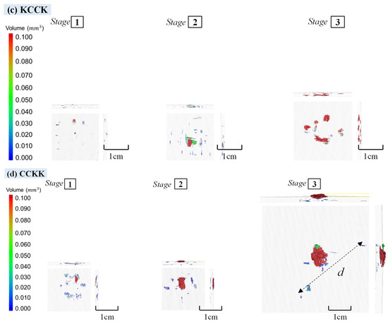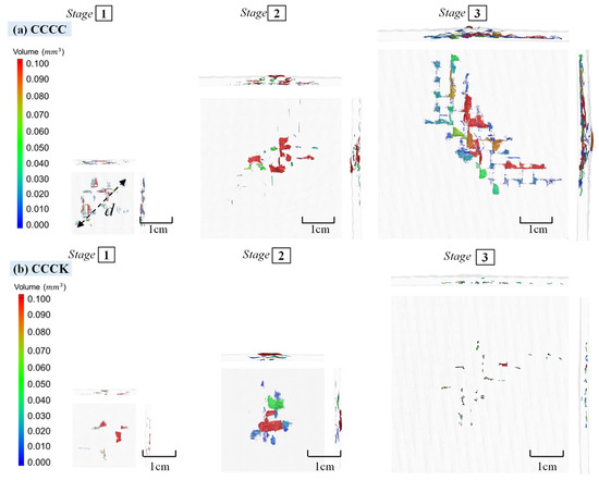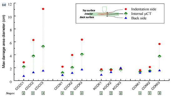 The changes in the maximum diameter of the internal damage volume of four typical laminates (CCCC, CCCK, CCKK, and KCCK) from Stage (1) to Stage (3) were analyzed (shown in Figure 14). The results were compared with the maximum diameters of the surface area of damage observed in the macroscopic view, as shown in Figure 11; the quantitative data obtained are shown in Figure 14a.