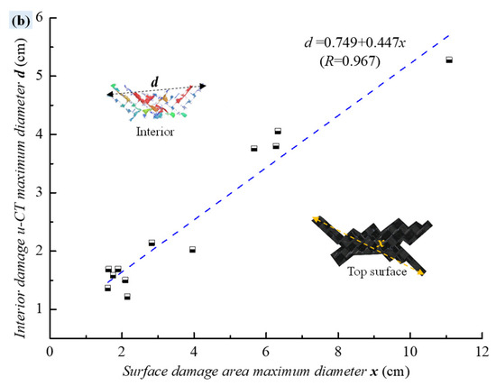 d was defined as the maximum diameter of the internal damage volume observed using μCT. It was found that d had a value between the maximum diameter of the indentation side and the reverse side; there was a good correlation between d and the maximum damage area diameter x on the indentation side (the correlation coefficient was 0.967, as shown in Figure 14b). The linear relationship between d and x was found to be as follows: