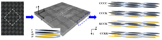 Carbon fiber-reinforced polymer (CFRP) composite laminates have the advantages of high strength, high modulus, and light weight, making CFRPs widely used in the aerospace and automotive industries [1]. However, CFRPs are sensitive to transverse low-velocity impact (LVI) load [1], which reduces their strength. A hybrid design has been proven to be an effective way to improve the mechanical properties of materials [2,3,4,5] and particular hybrid fiber designs including glass fiber, PP, natural linen fiber, etc., have been reported by numerous researchers [6,7] to improve the low-velocity impact resistance of carbon fiber laminates. Among these, Kevlar fiber is used in military uniforms due to its excellent toughness [8]; its use has grown in popularity in the last few years. The unidirectional [9,10], sandwich [11], three-dimensional orthogonal [12], plain weave [13], and 3D-printed unidirectional [14] forms of Kevlar/carbon hybrid structures have been extensively investigated under LVI, ballistic, and high-speed impact loading. For example, Gustin et al. [11] found that the distribution of Kevlar on the low-velocity impact side could enhance the energy absorption of sandwich laminates but reduced the stiffness of structures. Dorey et al. [9] demonstrated that Kevlar/carbon fiber hybrid materials exhibited a better overall impact performance compared with single-material laminate structures. Sojan Andrews Zachariah et al. [15] found through Charpy impact tests that laminates with two plies of aramid fabric at (0/90°) and (±45°) orientations on their outer surface displayed improved impact behavior in terms of average impact strength and absorbed energy. These findings indicate that different hybrid ply configurations affect the impact performance of specimens [16]. Therefore, the influence of hybrid ply number [17] and intercalation sequence [18] on the LVI performance of Kevlar/carbon fiber woven plain structures was investigated; it was found that the impact performance of carbon laminates could be improved through utilizing the appropriate Kevlar ply configuration. However, previous studies were limited by their short duration of LVI load, making it challenging to assess the damage evolution within each component of hybrid specimens through experimental methods during the loading process. Significantly, explicitly understanding the initiation and propagation processes of damage in hybrid composite materials and recognizing the failure modes of each component under loading [19,20] are essential for targeted structural optimization and design [21]. Therefore, it is necessary to investigate the influence of Kevlar plies and their configuration on the damage evolution of carbon fiber/Kevlar laminates.