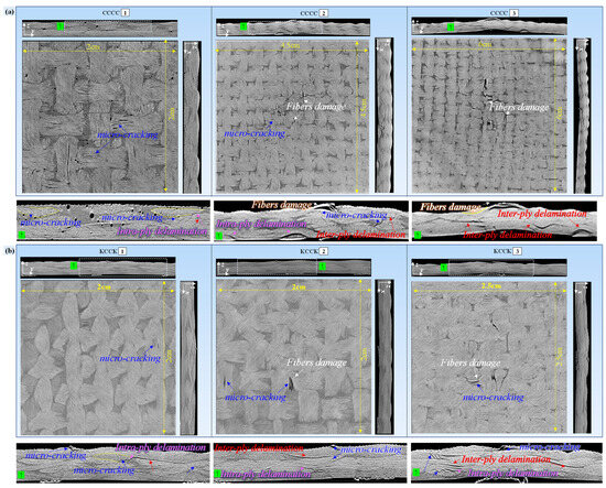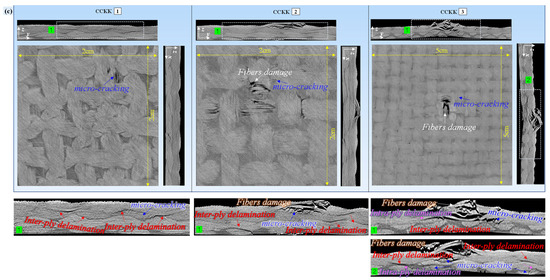 According to the QSI test, the fourth stage included the serious failure of composite laminates with large deflection deformation. In order to understand the process of evolution of the internal damage to the laminates under different QSI deflection states from Stage (1) to Stage (3), before the final failure, the porosity changes of four typical composite configurations, namely CCCC, CCCK, CCKK, and KCCK, were characterized using μCT, as shown in Figure 13.