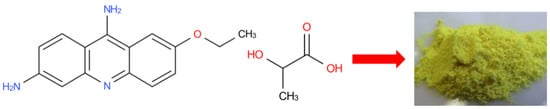 Ethacridine lactate (Figure 1) was supplied by Merck (Darmstadt, Germany). Chemical Company (Iași, Romania) provided hydrochloride acid, sodium chloride and ethanol. Chempur at Piekary Ślaskie, Poland, provided sodium hydroxide and calcium chloride. BUCHI Laboratortechnik AG (Flawil, Switzerland) supplied low-viscosity-grade sodium alginate.