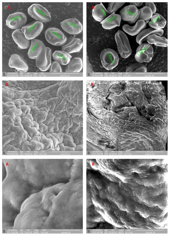 Scanning electron microscopy (SEM) was used to examine the morphological characteristics of the developed biosorbent. As several authors have stated, SEM is an effective and extensively used tool for investigating the morphological characteristics of adsorbent materials [,,]. SEM images of the beads before and after ethacridine lactate biosorption from aqueous solutions employing LLA 5% as the biosorbent are shown in Figure 3.