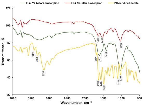 When analyzing the two spectra, before and after biosorption, it is visible that some peaks of the ethacridine lactate and a few of the biosorbent’s functional groups are overlapping. Also, 5% LLA beads after biosorption present a higher transmittance value than before biosorption. This is encountered between 3100 cm−1 and 3500 cm−1 (frequency for N-H bond) where the signal for the OH group in the lactate (2500–3300 cm−1) overlaps the broad band at 3271 cm−1 (OH stretching). Besides this, a relatively strong peak recorded at 1628 cm−1 is assigned to the C=N stretching vibrations existing in the ethacridine lactate’s acridine ring. The peak at 1026 cm−1, which corresponds to the stretching vibration of the C-O bond in secondary alcohols, is evident in both the EL and LLA 5% spectra after biosorption, indicating that EL is retained on the biosorbent surface. The peak at 807 cm−1 indicates the presence of Car-H out-of-plane deformation vibrations specific to ethacridine lactate [].