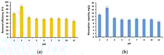 According to the data illustrated in Figure 6a,b, the same trend is observed for the removal efficiency as for the biosorption capacity. The lowest results are at pH 12, but similar for pH between 4 and 10. It should be mentioned that during the experiments, it was observed that at pH 2 and 12, deformations of the granules take place, and thus, at pH 2, the diameter decreases and at pH 12 increases as the swelling of the granules occurs.