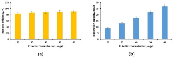 Influence of EL solution initial pH on removal efficiency (a) and biosorption capacity (b) (volume of EL solution: 10 mL; initial concentration of EL solution: 40 mg/L; biosorbent dose: 2 g/L; time: 24 h).