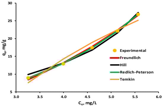 Adsorption isotherms describe the interaction of adsorbate and adsorbent and are critical for maximizing the utilization of any adsorbent []. The adsorption from the solution is assessed by measuring the decrease in the concentration of adsorbed species following absorption by solid. The adsorption isotherm is plotted as the amount adsorbed at equilibrium qe vs. the equilibrium concentration Ce at constant temperature. The shape of an isotherm reveals the stability of adsorbent–adsorbate interactions as well as the molecules’ adsorption affinity. On the other hand, the adsorption isotherm represents the adsorbent’s main property, which is its ability to remove a specific species from the solution. Furthermore, each part of the adsorption curve can provide information regarding potential sorption mechanisms [,].