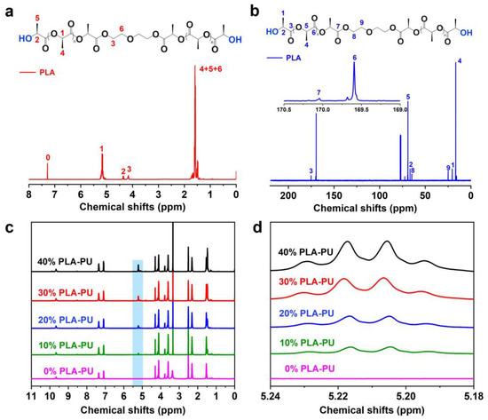 (a) The chemical structure of PLA-OH and its corresponding 1H NMR and (b) 13C NMR chemical shifts (the inset shows an enlargement of the chemical shifts from 169 to 170.5 ppm), (c) The 1H NMR of PLA-PUs in the organic phase. (d) The 1H NMR spectra (enlarged chemical shift from 5.0 to 5.5 ppm) of PLA-PUs in the organic phase.