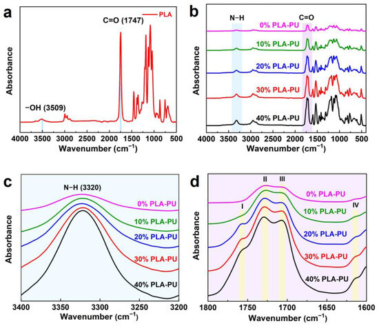 Figure 2a presents the characteristic peak of PLA-OH, including C=O (1747 cm−1) and −OH (3509 cm−1). The characteristic peak at 3509 cm−1 disappeared (Figure 2b), which means that PLA-OH was completely depleted in the reaction system [41]. The −NCO peak of MDI at 2270 cm−1 disappeared. It was confirmed that all the −NCO were totally reacted and formed carbamate bonds throughout the polymerization process [42]; the broad absorption band observed near 3300 cm−1 and 1700 cm−1 corresponds to the N−H (blue bar area) and C=O (purple bar area) vibrations of the urethane linkage (Figure 2b). It is well established that the N−H group serves as a proton donor, while the C=O group functions as a proton acceptor [43,44,45]. The presence of hydrogen bonds can be inferred from the N−H group at 3320 cm−1 (Figure 2c). The PLA-PU sample exhibited four absorption peaks (yellow bar area) for the C=O groups (Figure 2d), which are peaks I (1757 cm−1), II (1730 cm−1), III (1706 cm−1) and IV (1679 cm−1). To investigate the hydrogen bonds in the samples, peaks were fitted to the C=O region of the samples by infrared peak-splitting software (PeakFit V4.12). It is evident that in the 0% PLA-PU sample, only peaks II and III were observed (Figure S2a), which should be assigned to the free carbonyl group and the hydrogen-bonded carbonyl group in the hard domains, respectively. However, with the addition of PLA diol, peaks I and IV appear, and the intensities of the absorption peaks increase with the increasing content of PLA (Figure 2d). Peak I at 1757 cm−1 can be assigned to those free of hydrogen bonding, while the hydrogen-bonded ordered carbonyl groups are between 1730 and 1679 cm−1. The bonded C=O content in 40% PLA-PU was determined to be as high as 84.1% (Figure S2b), which was much higher than those of 0% PLA-PU (55.2%); peak IV at 1679 cm−1 is associated with hydrogen-bonded ones. The free hard segment might disperse in the soft matrix and form hydrogen bonding with the C=O group of the PLA component, which is manifested by peak IV. However, the compatibility between the hard segment and PLA domain was very limited, and a lot of C=O groups remained free.