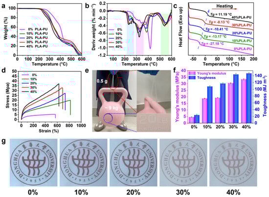 (a) Weight loss curves and (b) their derivatives of PLA-PUs. (c) Tg values of PLA-PUs determined by DSC. (d) Tensile stress–strain curves. (e) Display of mechanical properties of 40% PLA-PU film. (f) Young’s modulus and toughness of PLA-PUs. (g) Digital pictures (thickness of film is ~0.5 mm, closely attached to logo of Donghua University, Shanghai, China). Use of logo is permitted with permission by Donghua University.