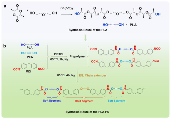(a) Synthesis route of PLA-OH. (b) Synthesis route of PLA-PUs from PLA-OH, PEA polyols, MDI and EG.