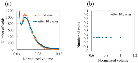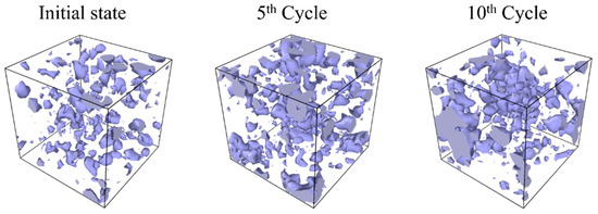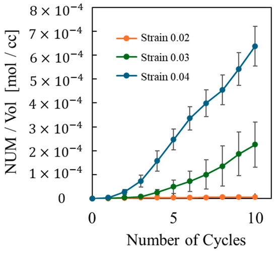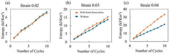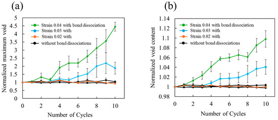 - Entropy and void volume increase with both the number of cyclic loadings and their amplitude, resulting in the thermosetting polymer exhibiting inelastic behavior. The accumulated entropy and void volume showed a strong positive correlation with the number of dissociated bonds.