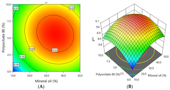 The dependence of the emulgel pH on the concentration of mineral oil and polysorbate 80: (A) 2D graph; (B) 3D graph.