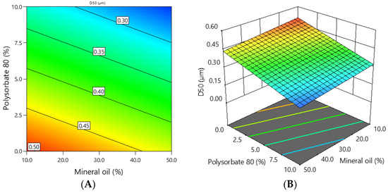 Factor A (mineral oil) and factor B (polysorbate 80) are statistically significant in the model (p = 0.0014 and p < 0.0001, respectively). However, polysorbate 80 had a greater influence on the average particle size of emulgels according to the coefficients of the coded factors in the equation (coefficient is 0.09) than mineral oil (coefficient is 0.03).