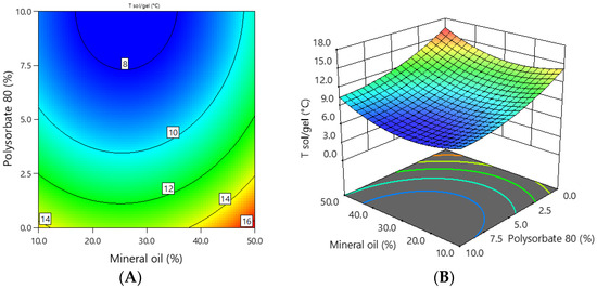 The dependence of the sol–gel transition temperature of the emulgel on the concentration of mineral oil and polysorbate 80: (A) 2D graph; (B) 3D graph.