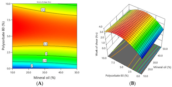 The dependence of the shear work of the emulgel on the concentration of mineral oil and polysorbate 80: (A) 2D graph; (B) 3D graph.