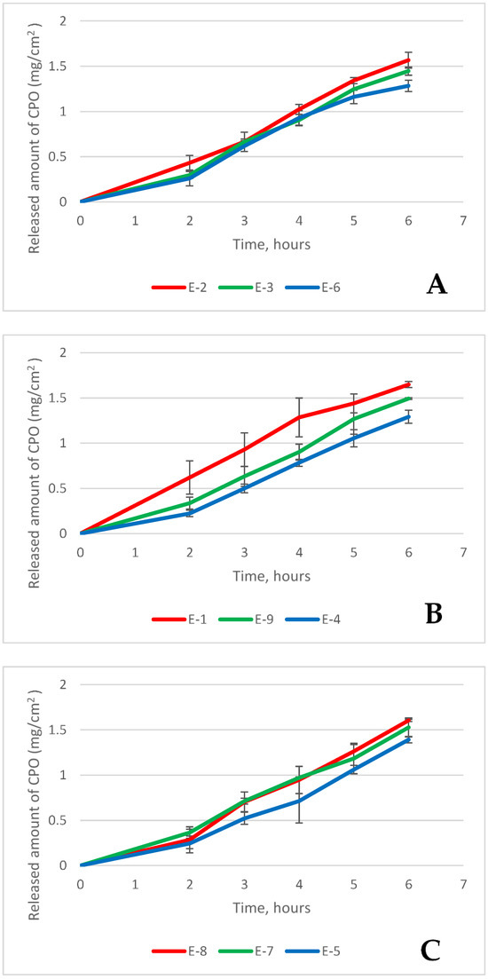 The profiles of ciclopirox olamine release from emulgels: (A) emulgels with 10% oil, (B) emulgels with 30% oil, (C) emulgels with 50% oil.