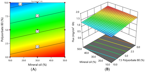 Factor A (mineral oil) and factor B (polysorbate 80) are statistically significant in the model (p = 0.0086 and p < 0.0001, respectively). However, polysorbate 80 had a greater influence on the release flux of ciclopirox olamine from emulgels according to the coefficients of the coded factors in the equation (coefficient is 3.32) than mineral oil (coefficient is 1.12).