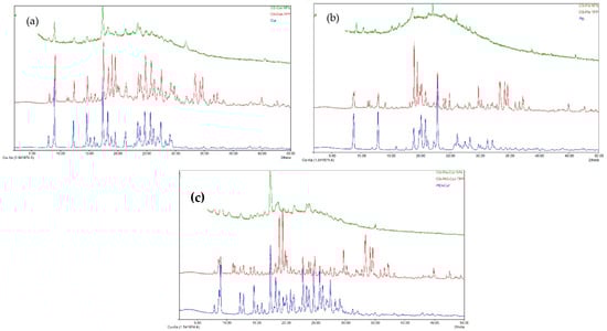 The analysis of the APIs’ diffractograms revealed that the Cur, Pio, and Cur-Pio physical mixture were in a crystalline state, their diffraction profiles being confirmed through the reported data [,]. Cur (Figure 2a) presents strong and sharps diffraction peaks at 2θ angles of 9°, 12.26°, 14.58°, 17.36°, and 18.24° and more peaks in the angle range of 20° to 30°. Referring to Pio (Figure 2b), multiple obvious sharp peaks were observed at 2θ angles of 8.7°, 12.8°, 18.82°, and 22.82°. The crystalline structure of Cur and Pio was preserved in the CS-APIs-TPP physical mixture (Figure 2c).