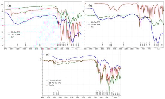 The characteristic absorption peaks of Cur and Pio were also identified in the IR spectra of the CS-APIs NPs (CS-Cur NPs, CS-Pio NPs, and CS-Pio-Cur NPs) (Figure 3), which proved the loading of the APIs into the polymer matrix. For Cur, the characteristic peaks were shifted to 1582 cm−1 (C=C), 1520 cm−1 (C=O), 1065 cm−1 (C-O-C), and 887 cm−1 (CH), while for Pio, the characteristic peaks were shifted to 1504 cm−1 (CH2), 1528 cm−1 (C=C), and 1628 cm−1 (C=O). These recorded shifts could indicate that some interactions between the APIs and CS occurred in the CS-Pio-Cur NPs.