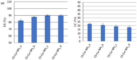 For the CS-Cur NPs (Figure 4a), the EE of Cur varied from 82.46% ± 1.74 (CS-Cur NPs_a) to 90.11% ± 1.01 (CS-Cur NPs_d), while the LC value decreased from 22.31% ± 0.94 (CS-Cur NPs_a) to 18.01% ± 1.61 (CS-Cur NPs_d). The most proper CS-Cur NP formulation seemed to be CS-Cur NPs_a, for which proper EE and LC values were recorded (EE = 82.46% ± 1.74; LC = 22.31% ± 0.94).