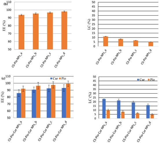 The effect of APIs’ concentration on EE (%) and LC (%) for CS-Cur NPs (a); CS-Pio NPs (b); and CS-Pio-Cur NPs (c) (p < 0.05).