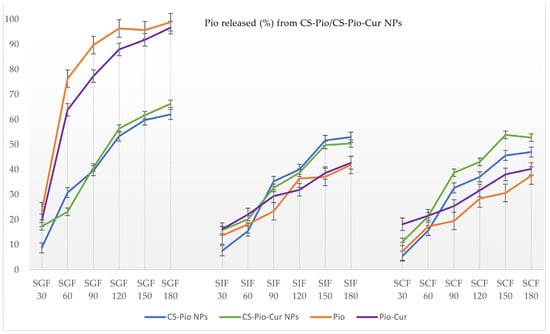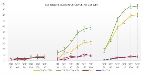 In similar experimental conditions, the value recorded for Cur released from the CS-Cur-NPs was much higher than pure Cur, explained by the CS-based formulation. For example, in SCF, the value recorded at 180 min was 80.34 ± 4.20% in comparison with the value of 6.20 ± 2.40% recorded for Cur. In addition, the presence of Pio improved the kinetic profile of Cur released from the CS-Pio-Cur NPs. The value recorded for Cur released from the CS-Pio-Cur NPs was 94.67 ± 3.90%, higher than the value of 80.34 ± 4.20% recorded for the CS-Cur NPs in SCF at 180 min.