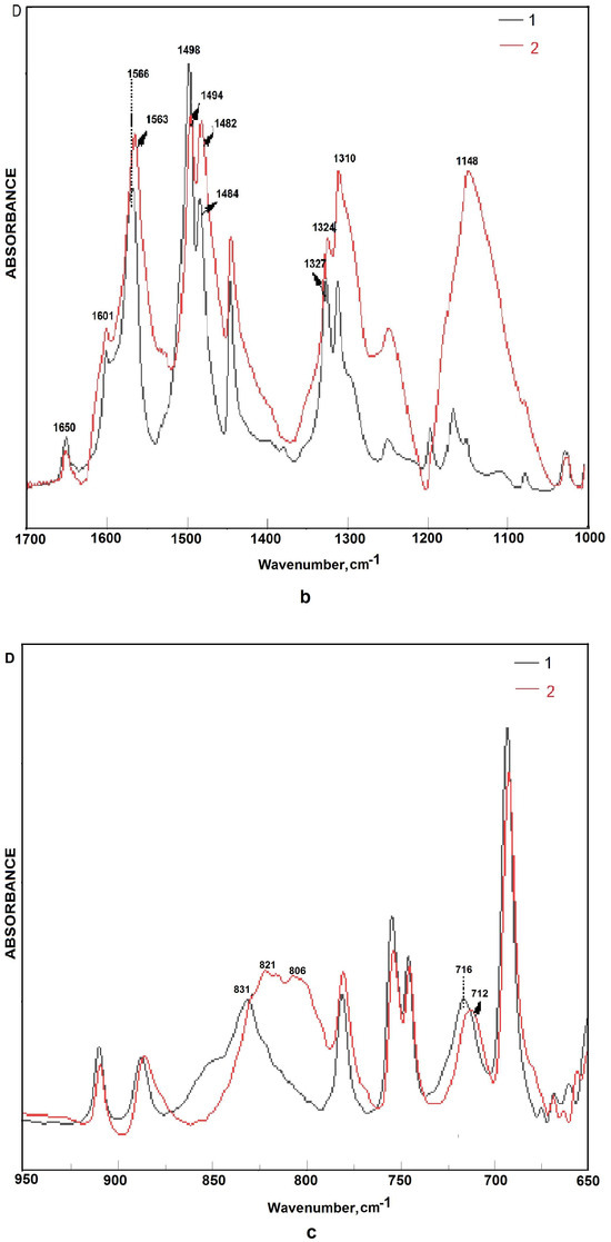 (a)—FTIR spectra of PDACB in a neutral (1) and salt (2) forms; (b)—detailing of the spectrum in the region of absorption bands of stretching vibrations of C = C(Ph), N-C bonds; (c)—detailing in the region of absorption bands of δCCH bending vibrations in aromatic rings.