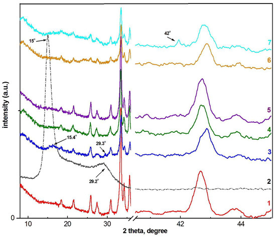 Powder X-ray diffraction (XRD) analysis was performed using a diffractometer “Difray” 401 (Scientific Instruments Joint Stock Company, Saint-Petersburg, Russia) with Bragg–Brentano focusing, using Cr-Kα (wavelength: 0.22909 nm) radiations