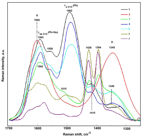 The Raman spectra of the PDACB/GO-2.1 and PDACB/GO-2.2 composites (Figure 4, spectra 4 and 5) were practically no different from the PDACB spectrum. The presence of GO in them was indicated by the D line, which had significantly lost intensity and was shifted to the short-wavelength region of the spectrum by 4 cm−1 (1349 cm−1). Line G coincided with the vibrational mode νas C=C(Ph+Qu) in the polymer spectrum (1593 cm−1). In other words, in this case, polymer chains formed on the interphase surface “envelop” GO, preventing its structural features from being recorded in the Raman spectrum. A significant decrease in the intensity of the signal at 1593 cm−1 indicates the interaction of PDACB with reduced GO due to π-stacking. This is also indicated by a decrease in the intensity of reflection peaks in the diffraction patterns of the composites (Figure 3, diffraction patterns 4 and 5) compared to PDACB (Figure 3, diffraction pattern 1) [3,62]. The absence of GO reflection peaks indicates the partial reduction of GO.
