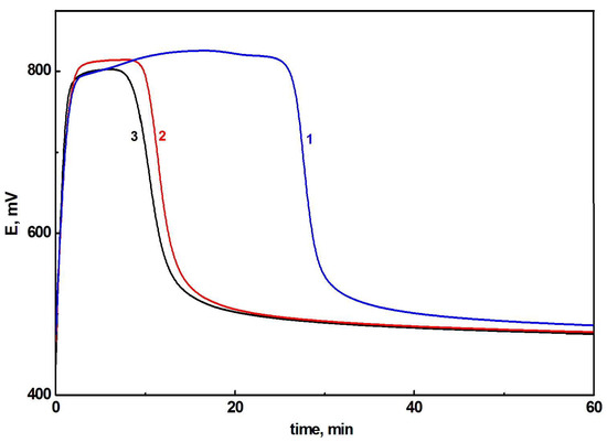 Changes in redox potential over time during oxidative polymerization of DACB: in the absence of GO (1); in the presence of 6% GO (2) and 12% GO (3).