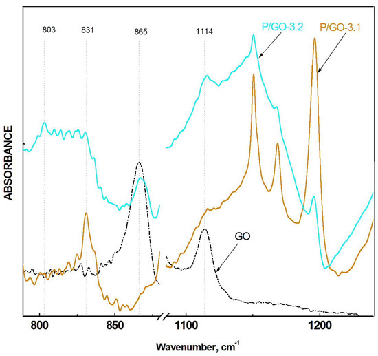 The synthesis of PDACB/GO-3.1 and 3.2 composites based on the prepared polymer and GO implies the post-reduction of GO → RGO. The IR spectra of these samples (Figure 2, spectra 6 and 7) were considerably different from the spectra of samples obtained via in situ polymerization in the presence of GO (Figure 2, spectra 4 and 5). Under prolonged heating of the suspension of PDACB and GO in DMF, alongside the reduction of GO, when the solvent evaporates, “dedoping” of PDACB (removal of the HCl dopant) also occurred. The IR spectra (Figure 2c, spectra 6 and 7) confirm this, demonstrating the absence of an absorption band in the region of 800 cm−1, which characterizes ammonium cations, and a shift of the band at 821 cm−1 associated with out-of-plane bending vibrations δCCH of 1,4-substituted aromatic rings to 831 cm−1, as observed in the spectrum of PDACB in neutral form (Figure 1a). The IR spectrum of PDACB/GO-3.1 (Figure 2, spectrum 6) showed the disappearance of spectral features of GO, which indicates the reduction of GO. There iswas however, no complete reduction of GO. This is evidenced by the absence of reflection peaks corresponding to RGO planes in diffractogram 6 in Figure 3. The formation of RGO was observed in the sample labelled as PDACB/GO-3.2. Diffractogram 7 in Figure 3 shows a distinct reflection peak corresponding to the 100 RGO plane [74,75,76,77]. Its low intensity is associated with the low content of GO in the sample volume and strong interaction with the polymer [3,57]. At the same time, the IR spectrum of PDACB/GO-3.2 (Figure 2a, spectrum 7) contained weak bands corresponding to the epoxy groups of GO (865 and 1114 cm−1) (Figure 6), indicating their incomplete reduction. This suggests the presence of residual amount of unreduced GO, which, acting as a dopant, ensures doping of the polymer layer despite the removal of HCl [57]. In the IR spectrum of the PDACB/GO-3.2, this was shown by the presence of a weak band at 803 cm−1 as well as broadening and splitting of the band in the region of 1070–1200 cm−1 (δ CH; ν-NH+ =) (Figure 6).