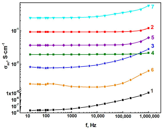 where ω = 2πf is angular frequency (f—denotes frequency), σdc—part of electrical conductivity of the sample at constant external current, equal to σac (with ω tending to 0), n—power law exponent, and A—temperature-dependent coefficient [82,83,84].